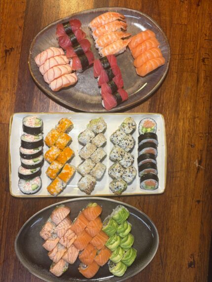 5 stk. laks, 5 stk. flambet laks, 5 stk. tun, 5 stk. seared tun, 5 stk. reje, 5 stk. avocado,