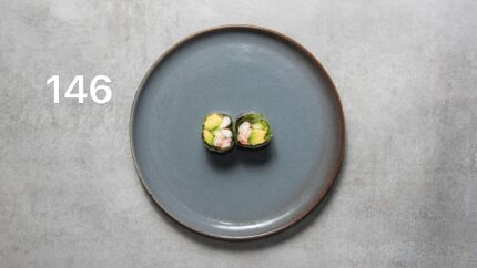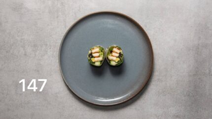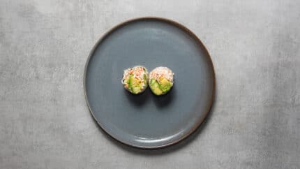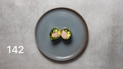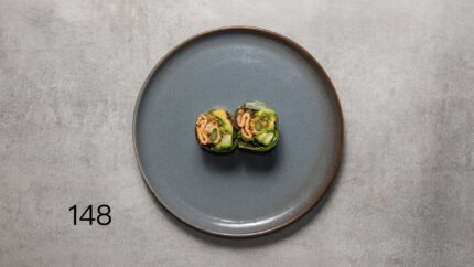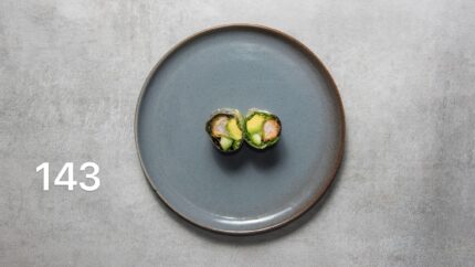 Med mix salat, avocado, agurk cashewnødder og goma dressing.