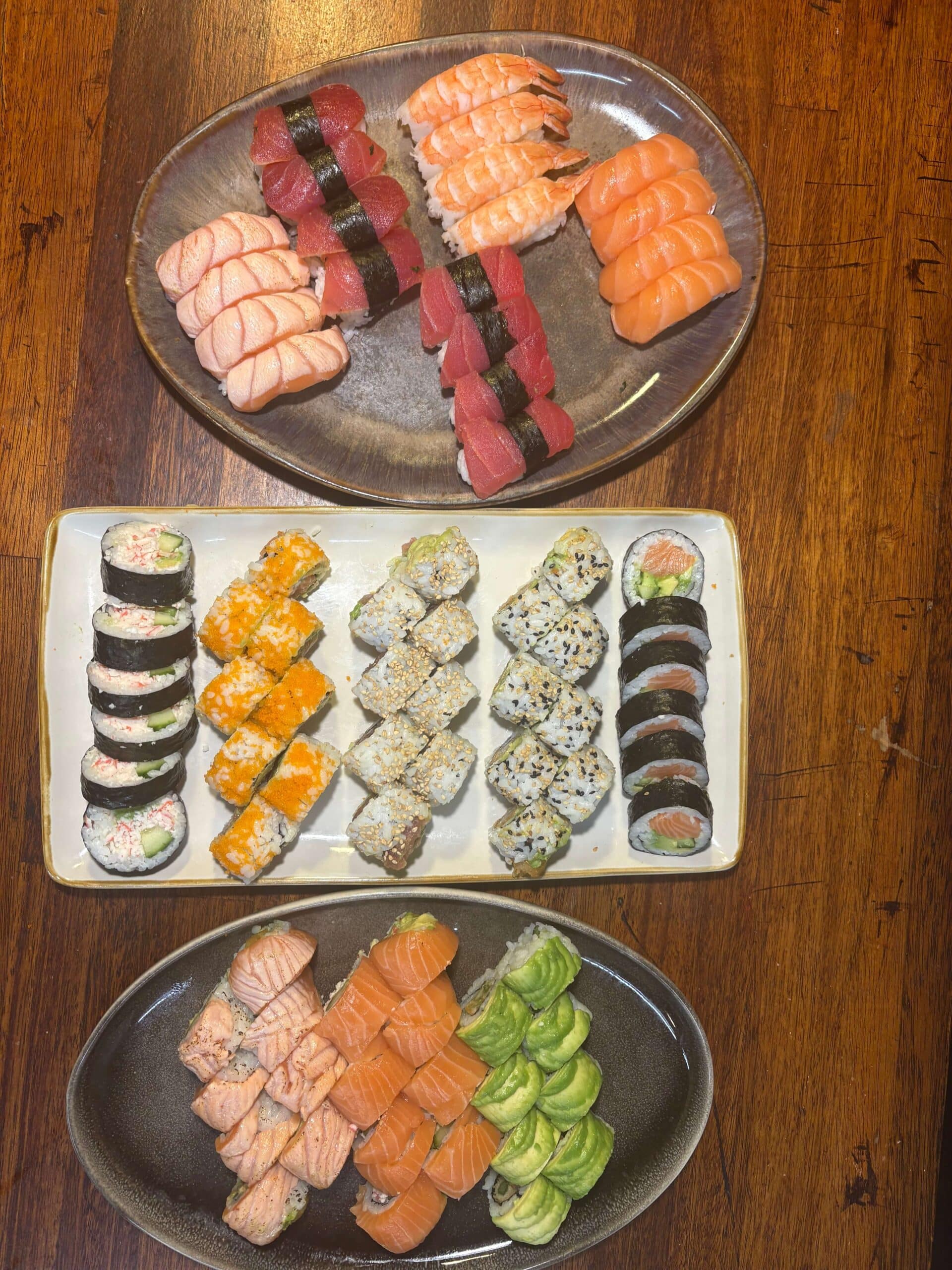 4 stk. laks, 4 stk. flambet laks, 4 stk. tun, 4 stk. seared tun, 4 stk. reje,