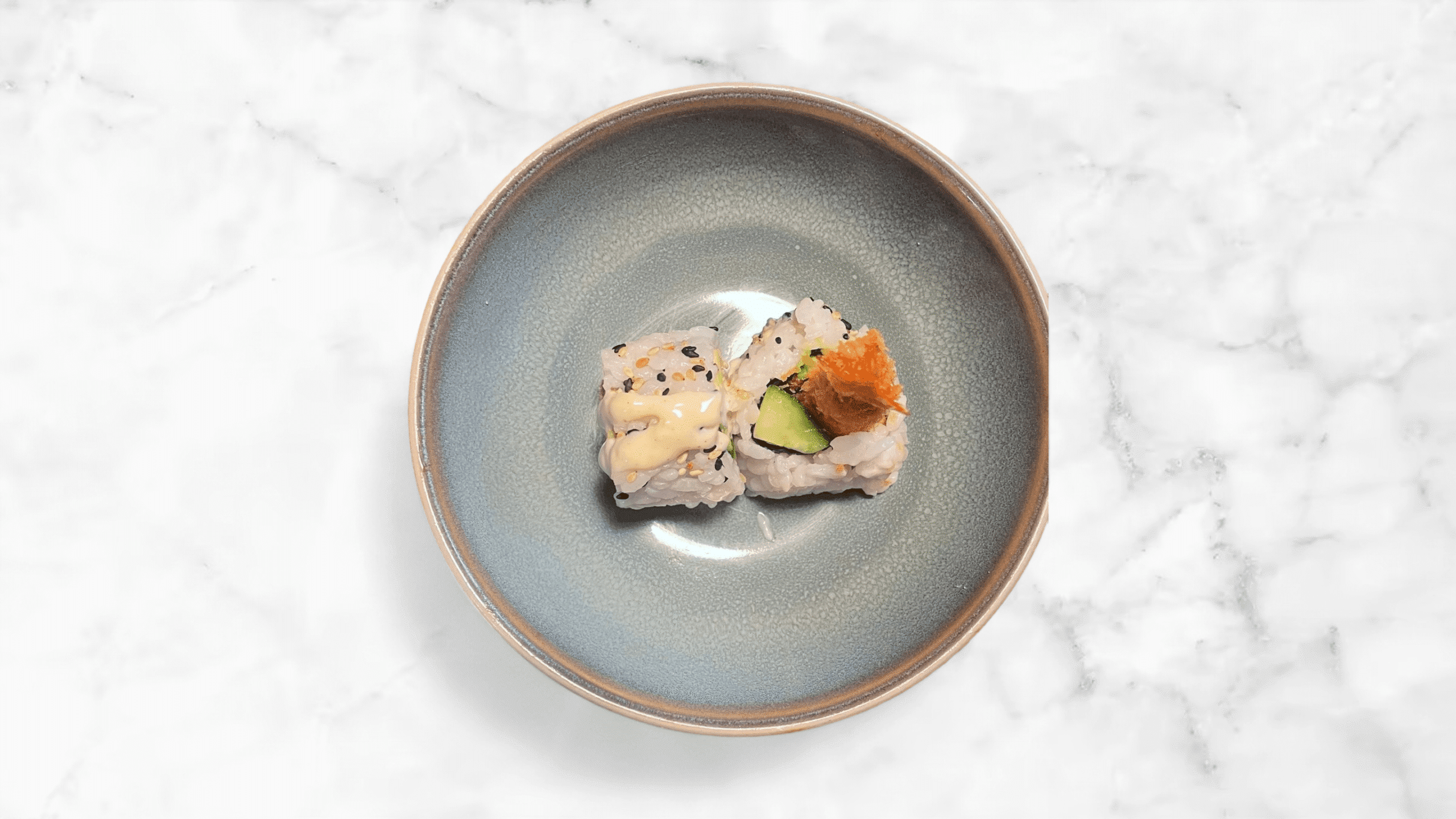 Med indbagt rejer, avocado, agurk, hvidløg mayo og sesam.