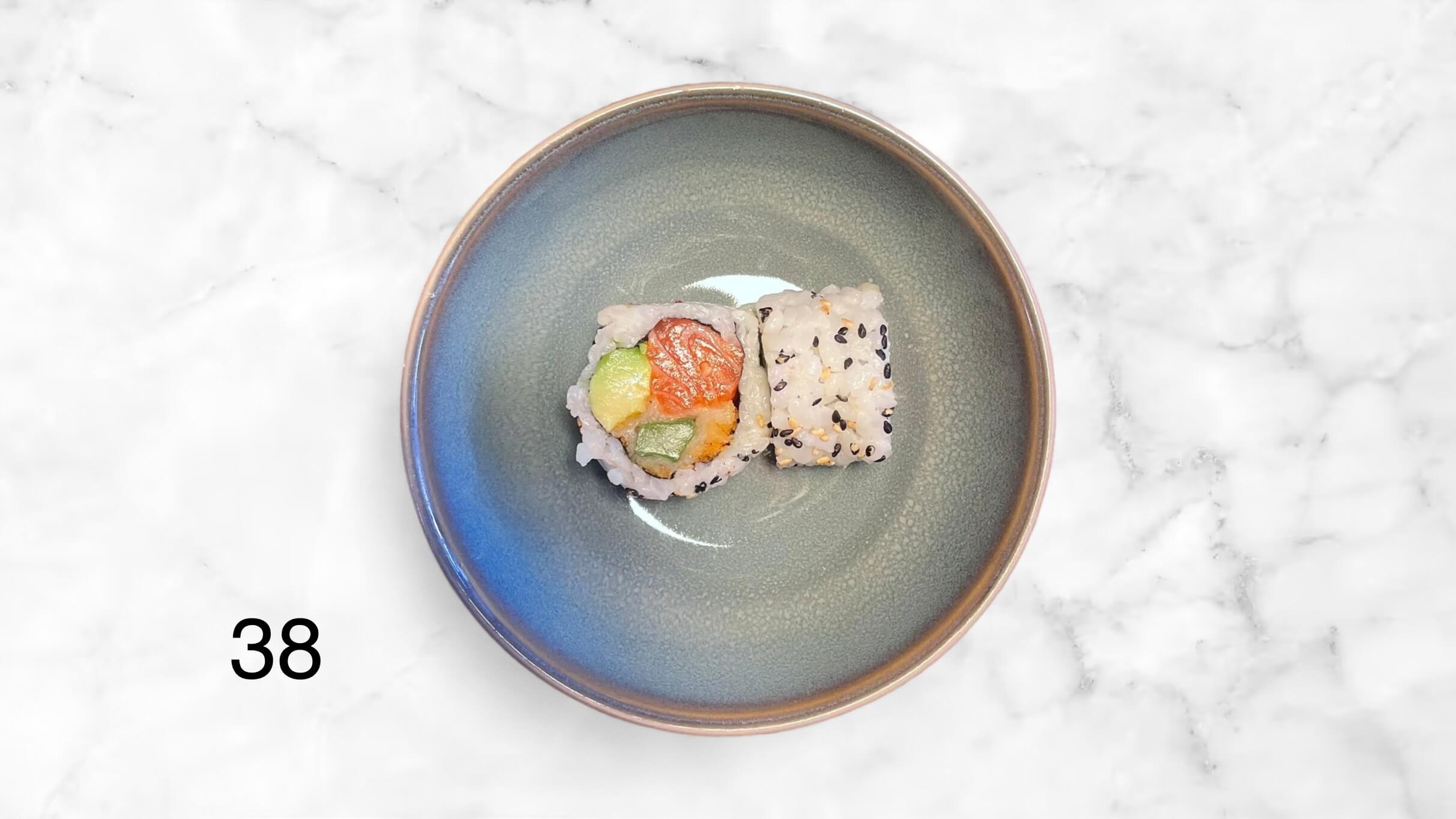 Med laks, tempura asparges, avocado, chilimayo og sesam.