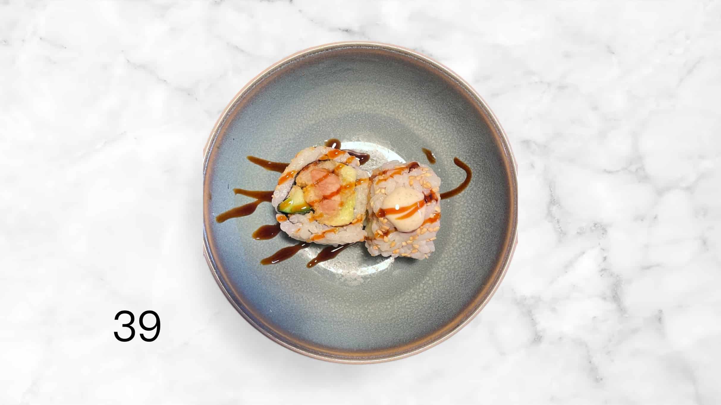 Med indbagt and, avocado, agurk, hvidløg mayo og sesam.