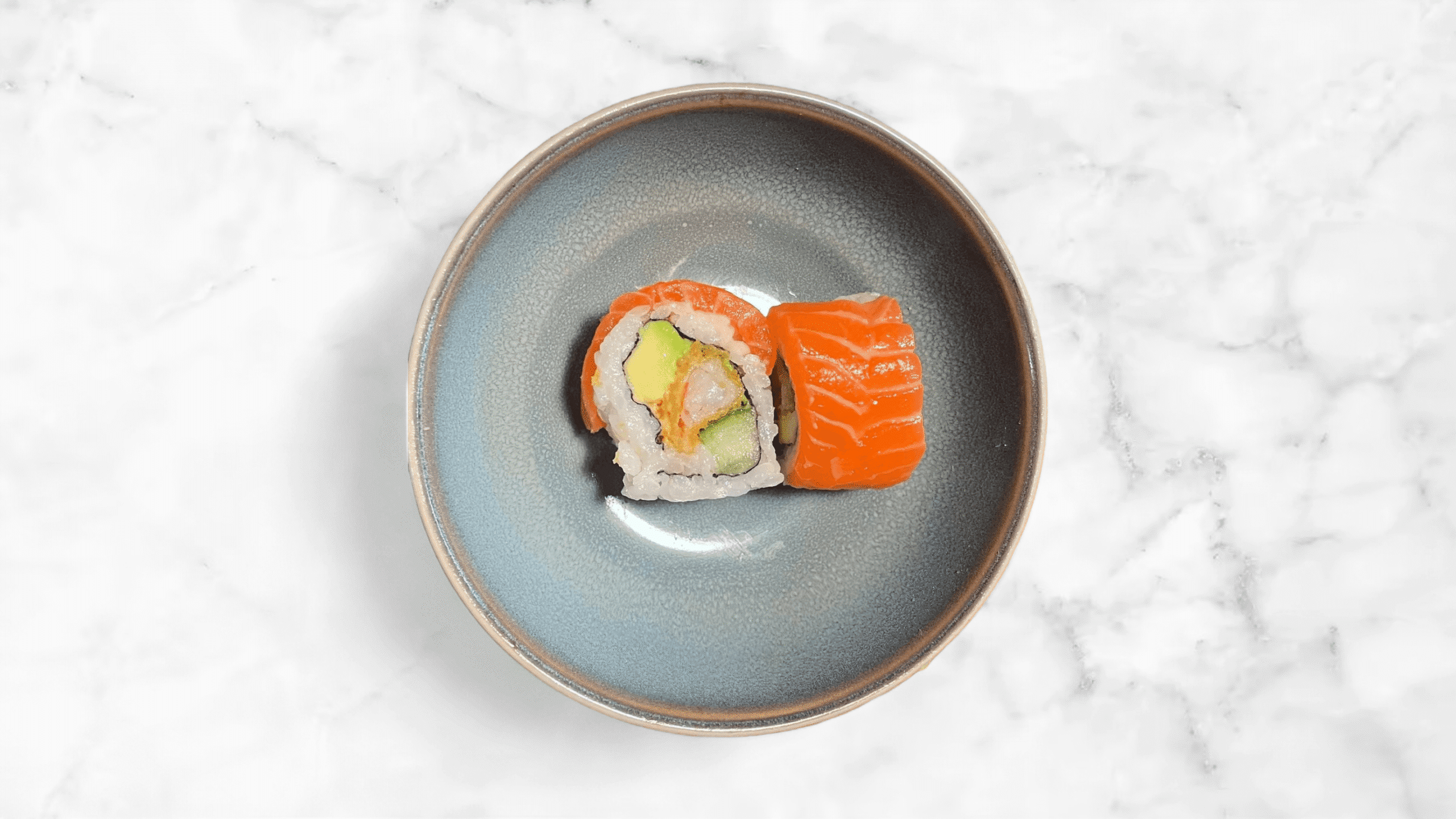 Med indbagt rejer, avocado, agurk og chilimayo.