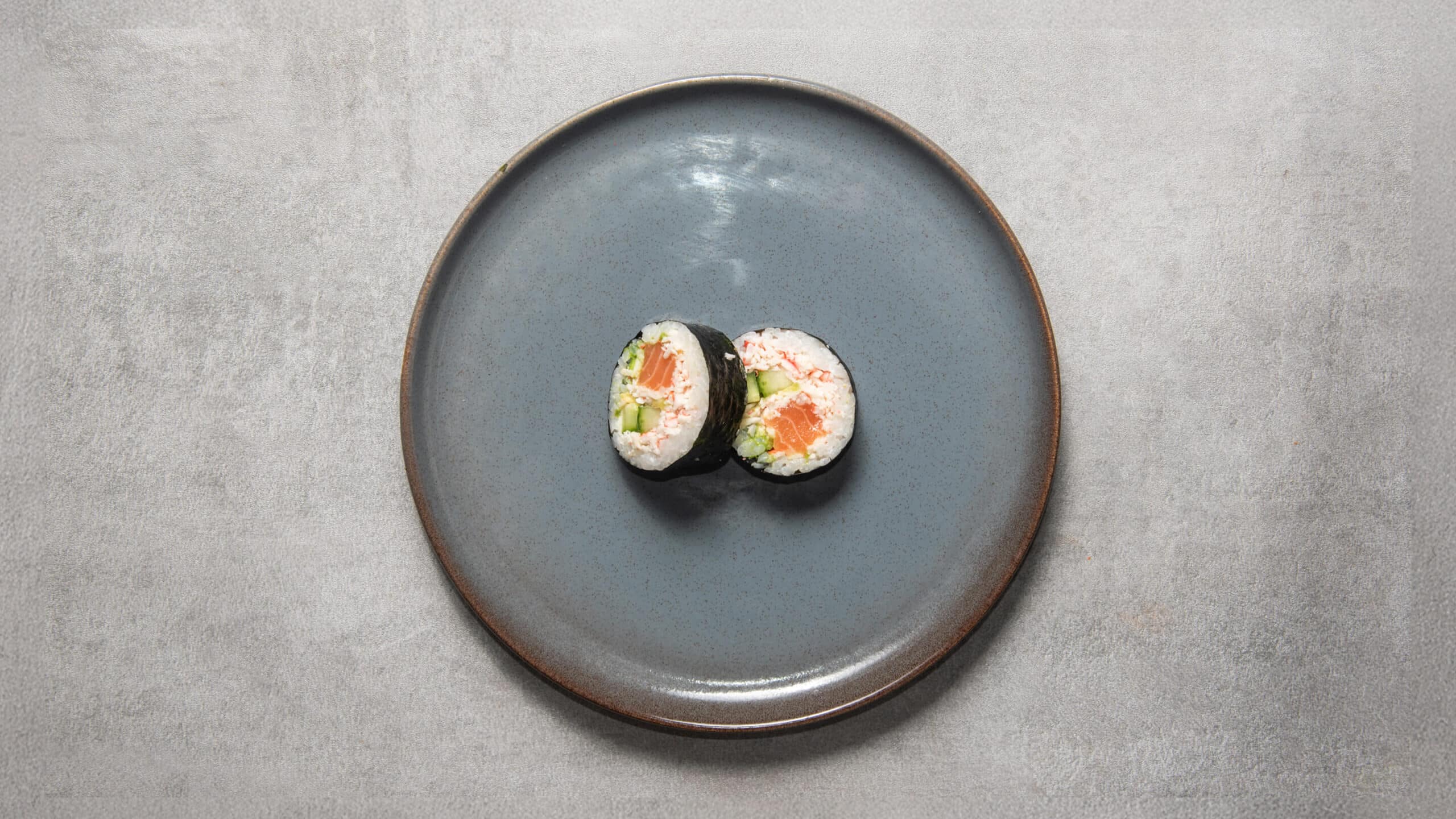 Med surimi, laks, avocado, agurk og sesame.