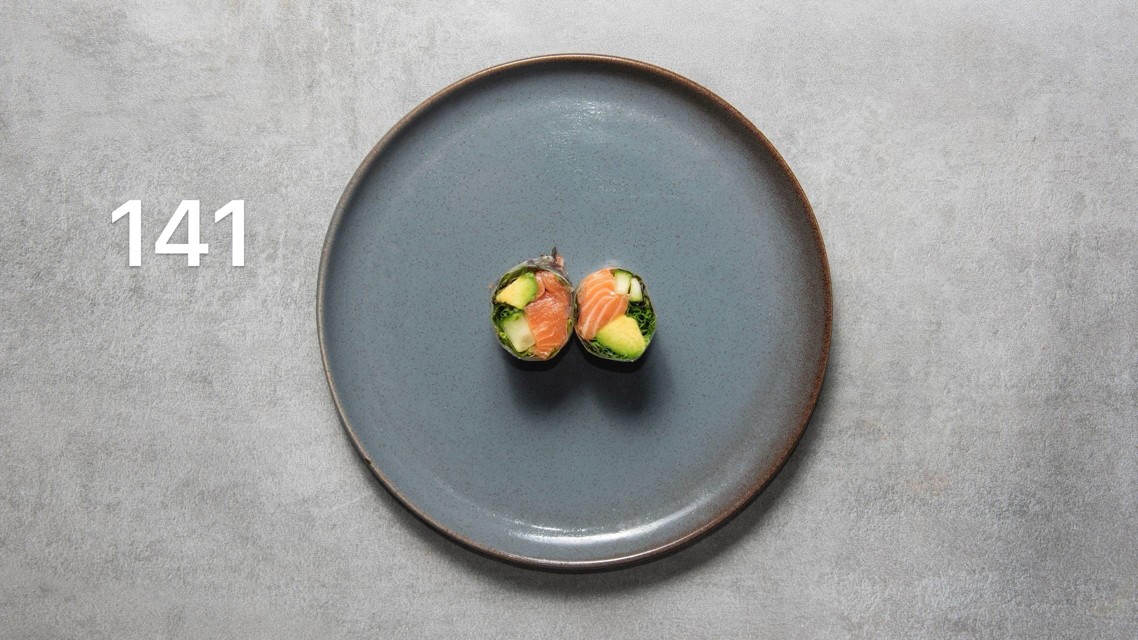 Med mix salat, avocado, agurk cashewnødder og goma dressing.