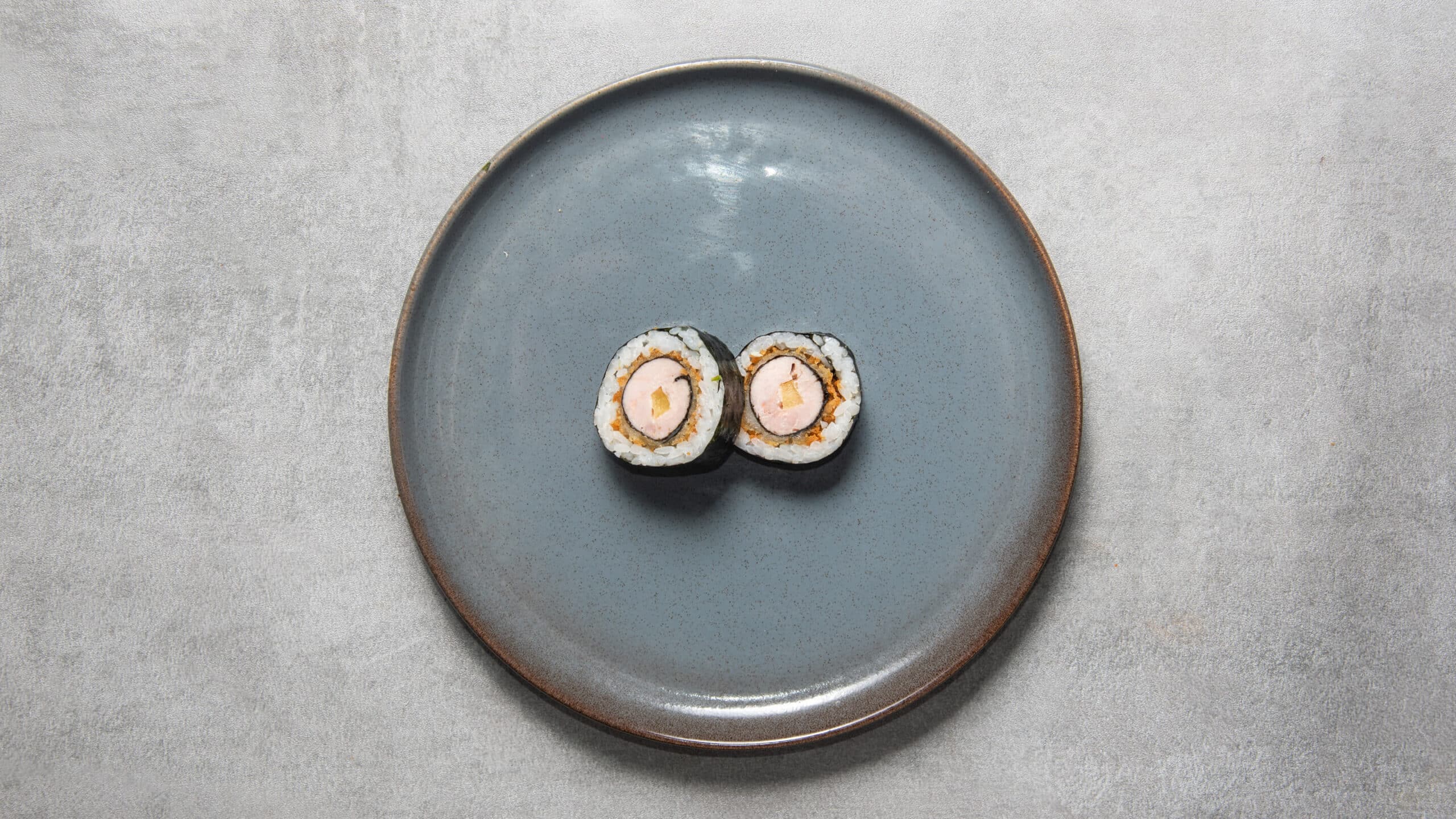 Med tempurastegt tun, mango, chilimayo og teriyaki sauce.